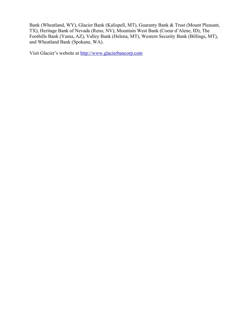 Bank (Wheatland, WY), Glacier Bank (Kalispell, MT), Guaranty Bank & Trust (Mount Pleasant, TX), Heritage Bank of Nevada (Reno, NV), Mountain West Bank (Coeur d’Alene, ID), The Foothills Bank (Yuma, AZ), Valley Bank (Helena, MT), Western Security Bank (Billings, MT), and Wheatland Bank (Spokane, WA). Visit Glacier’s website at http://www.glacierbancorp.com